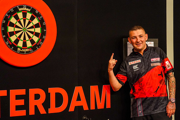 ROTTERDAM, NETHERLANDS - APRIL 20: Nathan Aspinall of England celebrating win during the 2023 Cazoo Premier League - Rotterdam at Rotterdam Ahoy on April 20, 2023 in Rotterdam, Netherlands (Photo by Joris Verwijst/ BSR Agency/Getty Images)