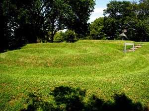 About one quarter of the palace to the northeast was taken up by a great square called Rahbat al-Eid ("Festival Square"), measuring 157 by 105 meters, which was the starting point for the caliph's processions through the city.[4] One of the eastern gates, called Bab al-Zumurrud ("Emerald Gate"), opened off this square and gave access to the part of the palace known as the Emerald Palace, the private residence of the caliph.[4] Another gate opening off the southern side of the square was called Bab al-Eid. An arsenal hall, called Khizanat al-Bunud (roughly the "Arsenal of Banners/Flags"), lay to the east of the palace, as did a gate known as Bab Qasr al-Sharq ("Eastern Palace Gate").[4] The southeastern gate, Bab Daylam ("Gate of the Daylamites"), led to the monument that later became the shrine of al-Husayn (see below), while the southwestern gate was called Bab Turbat al-Za'faraan (or Bab al-Za'faraan), after the name of the adjacent royal mausoleum (see below).[4][7]