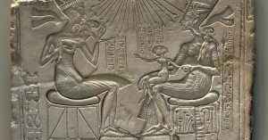 House Altar depicting Akhenaten, Nefertiti and Three of their Daughters, c. 1350 B.C.E. On limestone. Question. What are EACH sat on? Male / female. Next level up. Which and why?